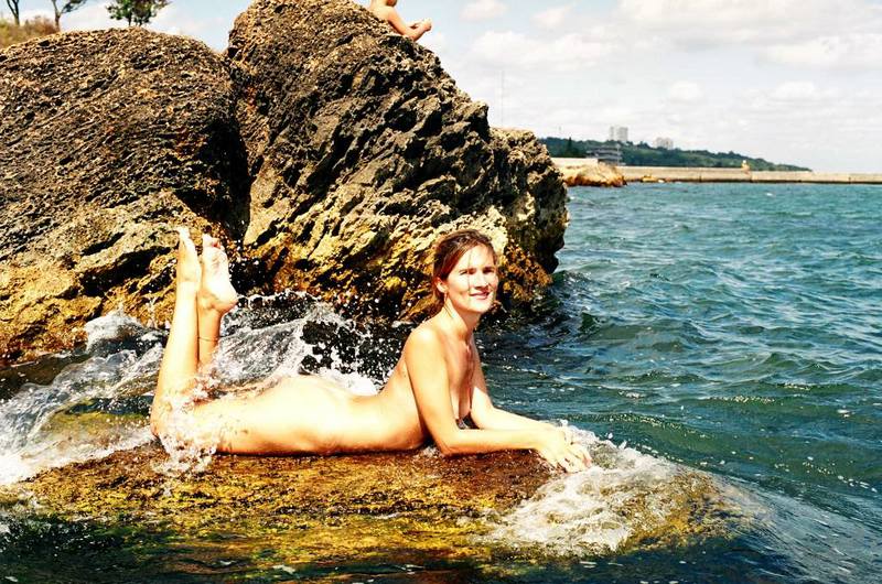 Young nudists rub oil on each others naked bodies